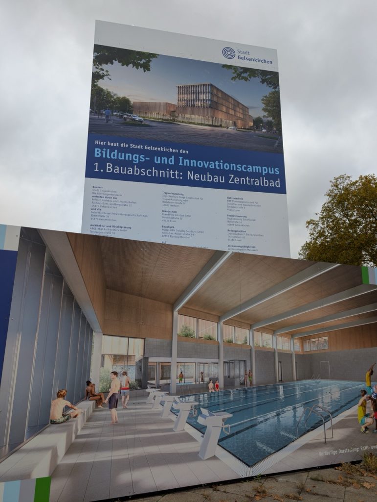 Hier baut die Stadt Gelsenkirchen einen Ort, der Bildung, Innovation und Sport vereinen wird. Auf dem Plakat seht ihr schon die ersten Eindrücke, was uns erwartet – ein moderner Campus mit neuem Zentralbad!